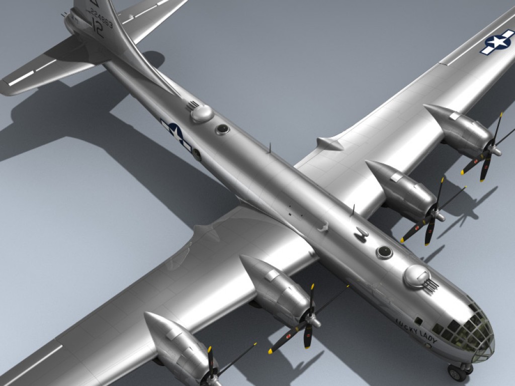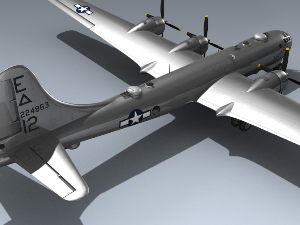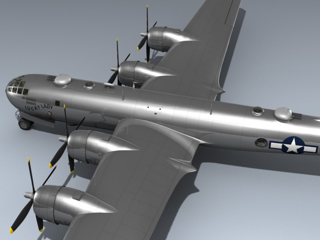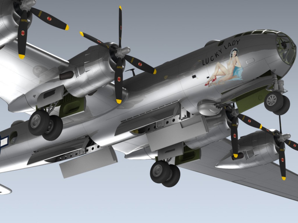 This extremely detailed 3d model depicts a World War II era B-29-50-BW featuring full cockpit, detailed bomb bays, gunners section, and historically accurate 'Lucky Lady' airframe markings.