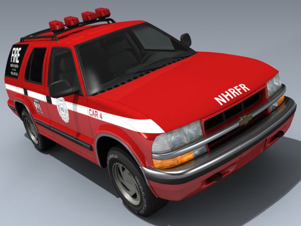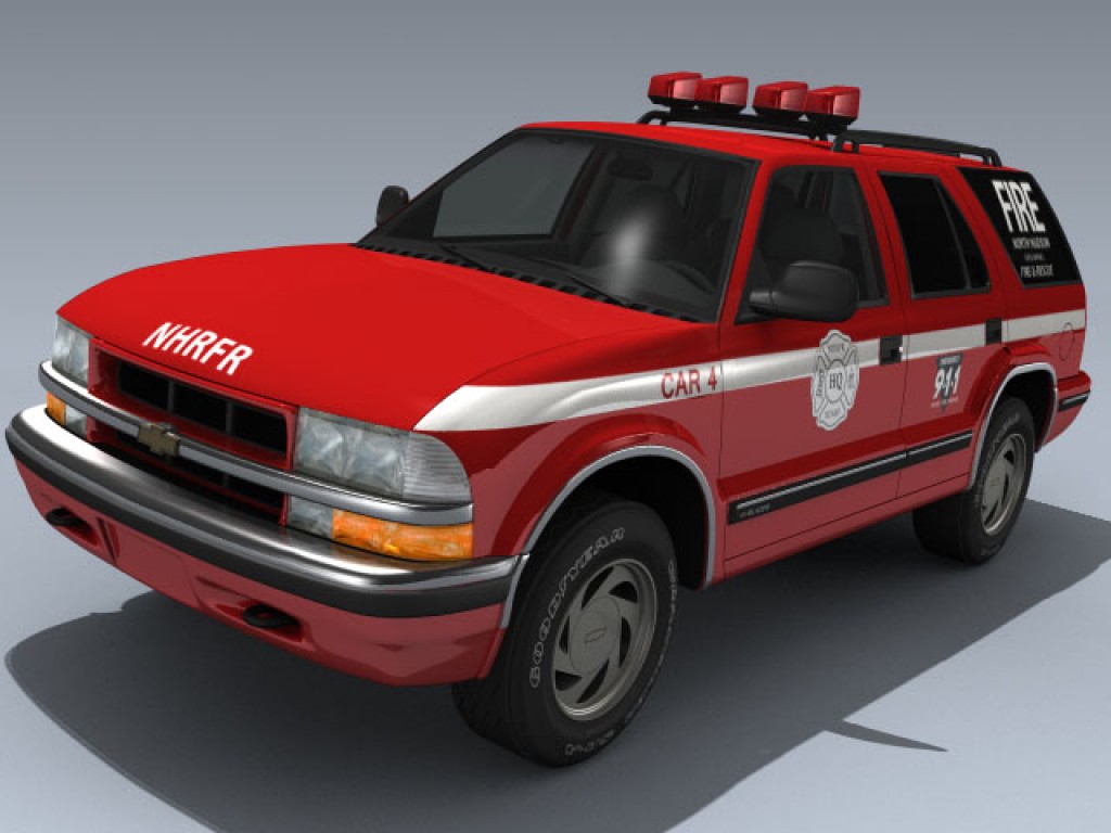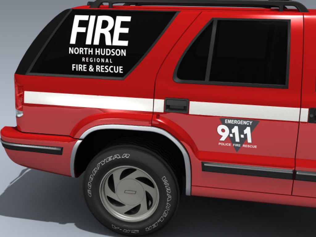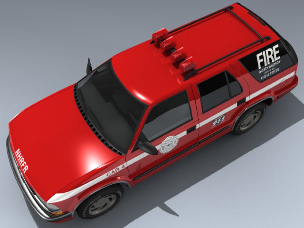 This is the 1998 Chevy Blazer 4-door in colors representing North Hudson Regional Fire and Rescue. The model features a very detailed exterior and a medium detailed interior. It also features separate doors, hatch, mirror, and wheels for animating.