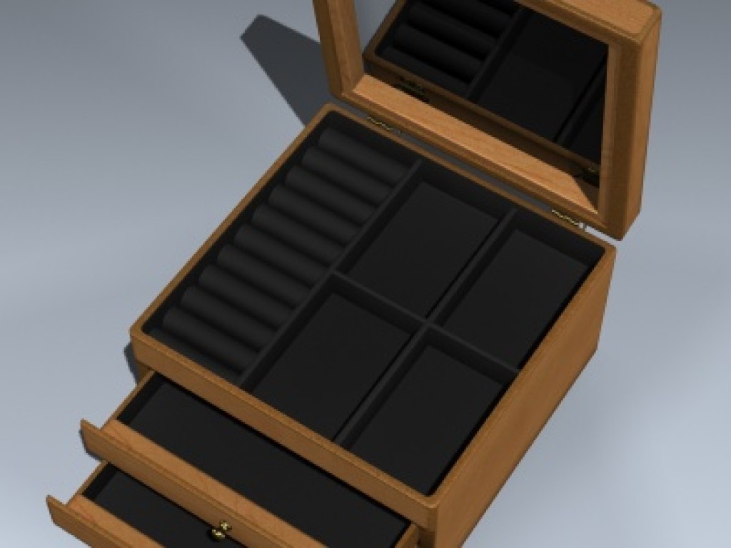 Very detailed maple veneer jewelry case with high resolution textures for close up rendering. Features separate lid, hinge parts and sliding drawers for animating.