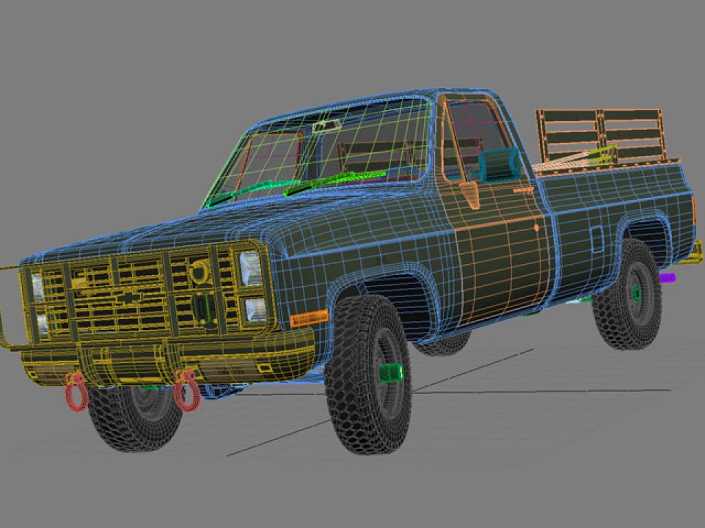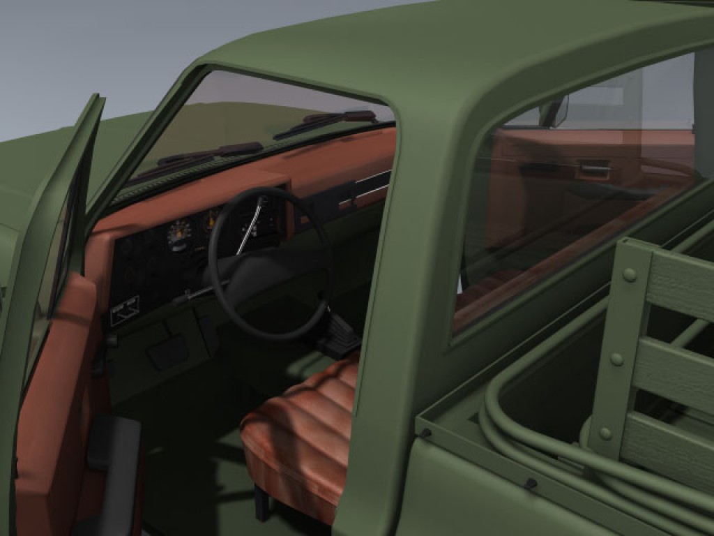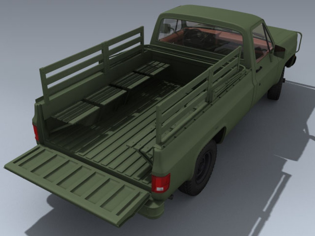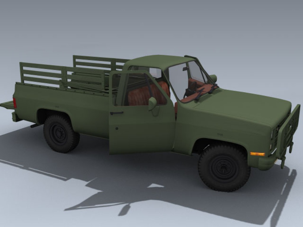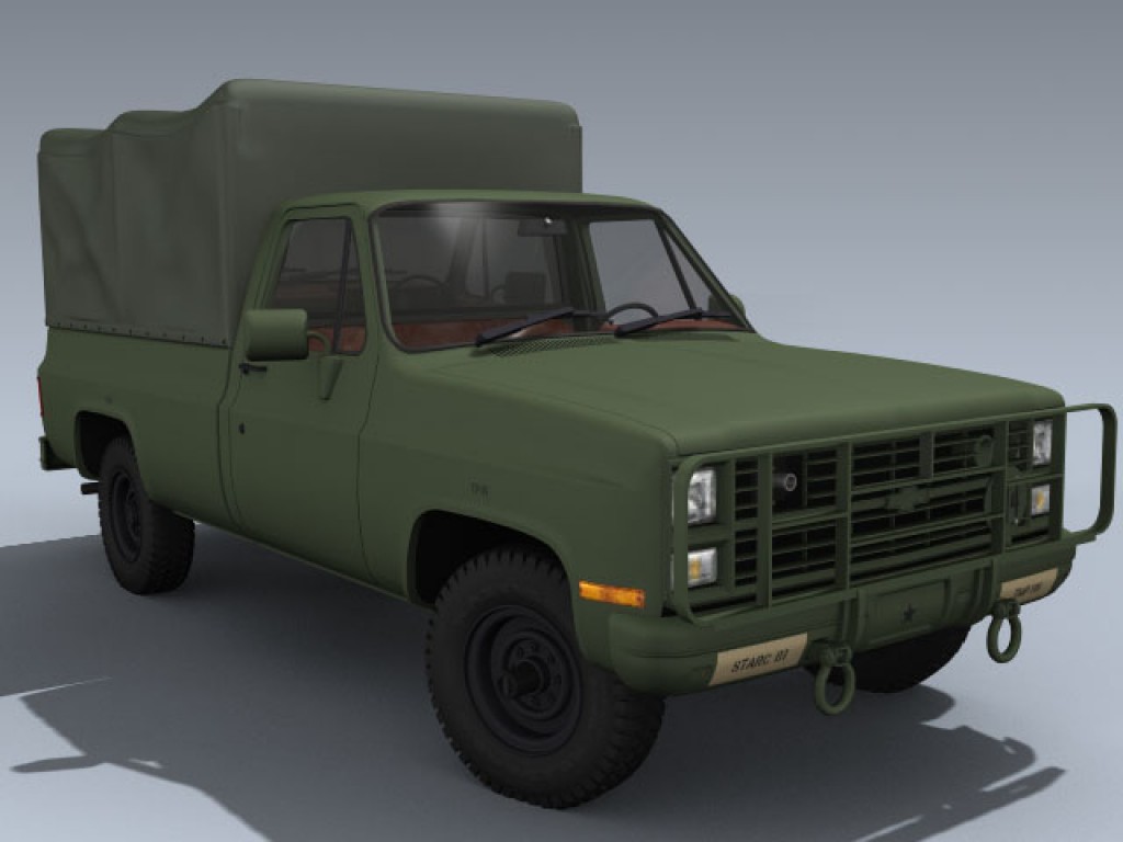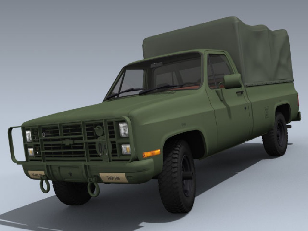 Very detailed and accurate U.S. Army M1008 pickup truck used extensively in the green paint scheme in the mid-1980s. Features separate doors, tailgate, troop seats, canvas cover, shelter frame, spare tire, mirrors, wheels, and steering bits for animating.