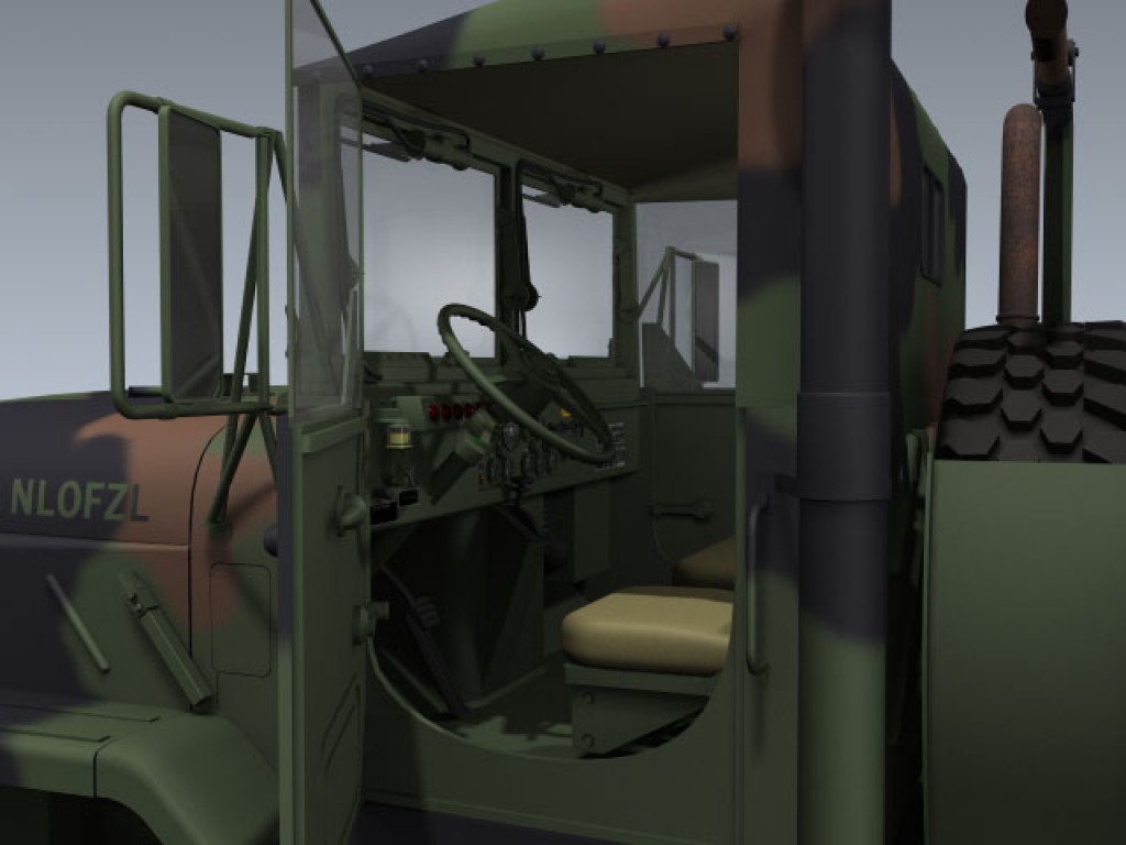 Includes separate canvas cargo top, spars, cab soft-top, vents, bed drop sides, tail gate, pintle, wipers, side and front cab windows, spare tire, tire crane, wheels, steering bits and driver seat for animating.