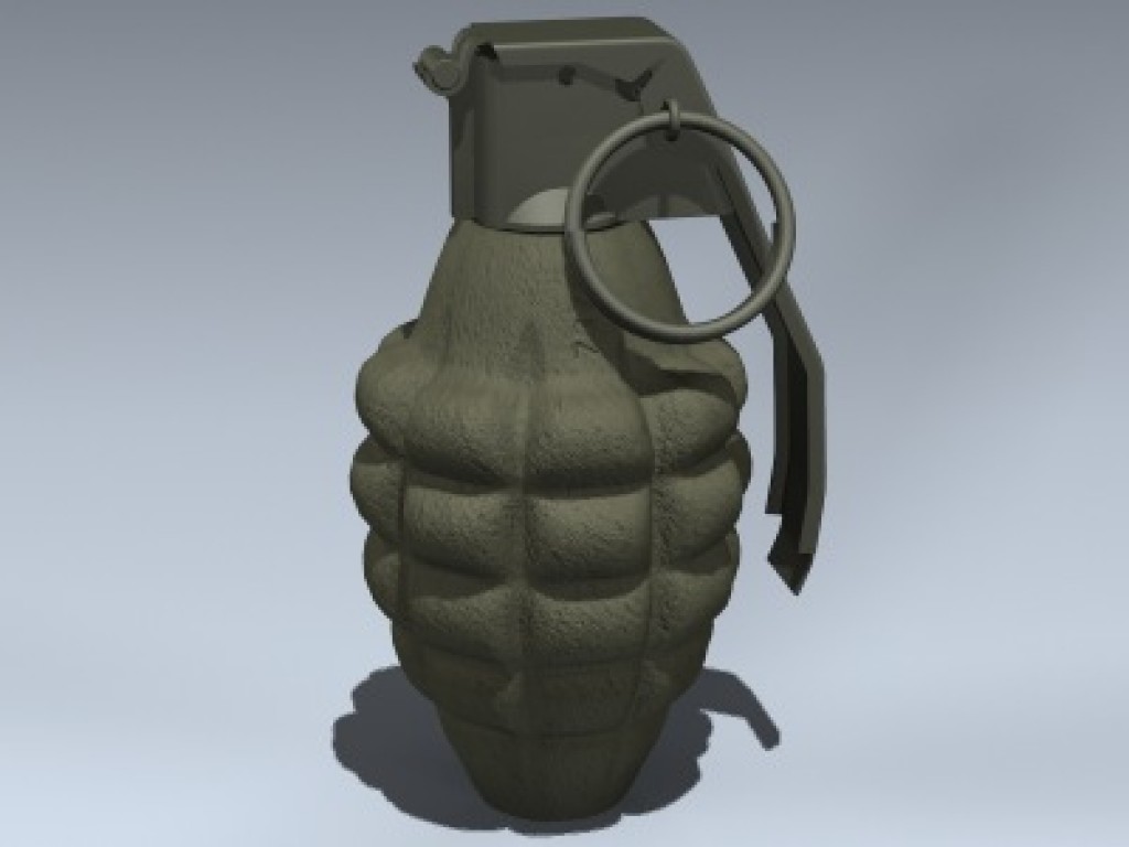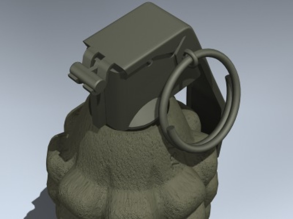 Detailed "pineapple" hand grenade with separate pin, ring and handle for animating.