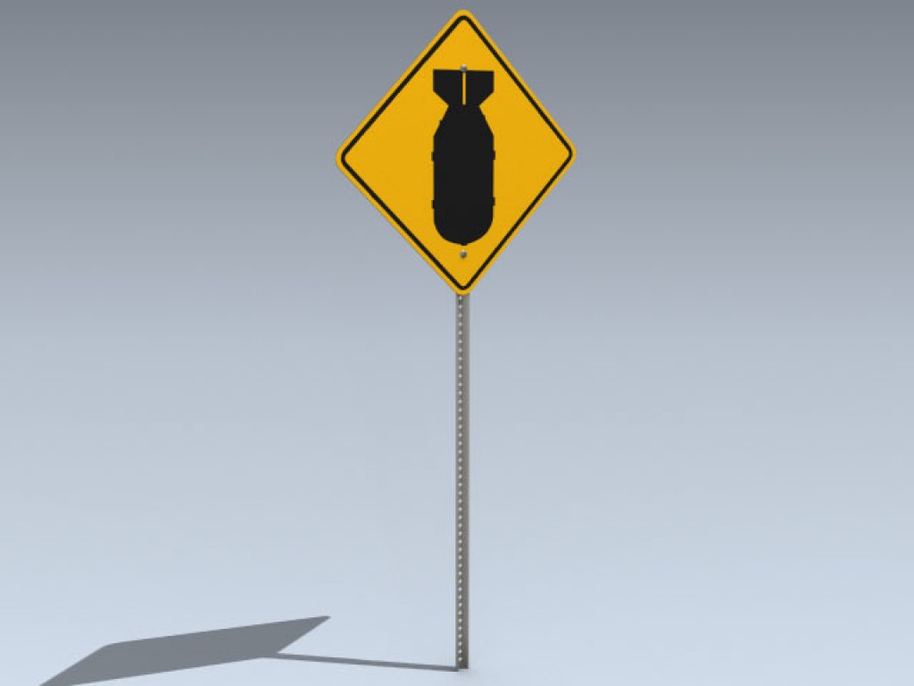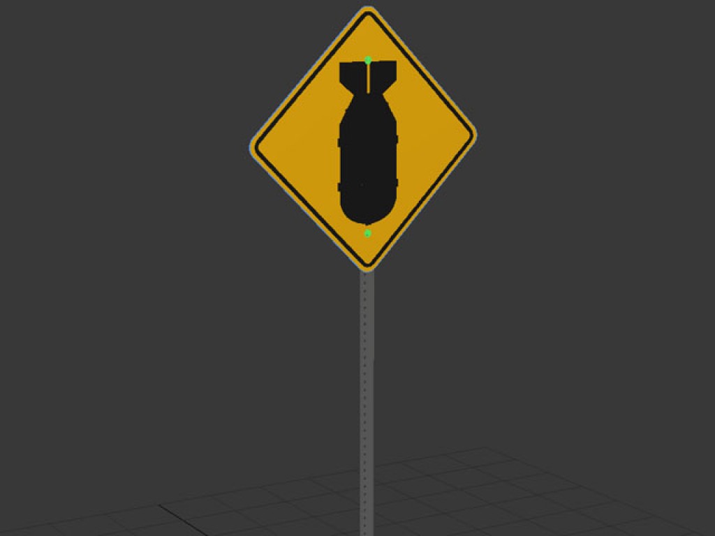Very detailed fictitious road sign with falling bomb graphic. Features a high resolution texture map for close up rendering.