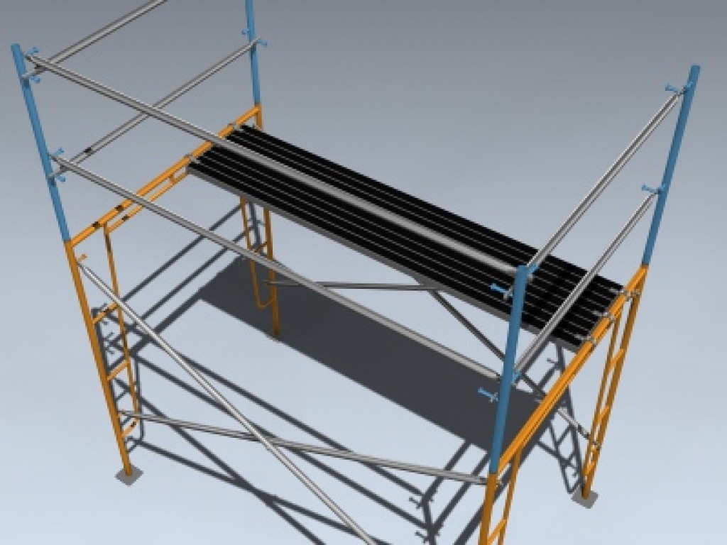 Very detailed modular scaffolding with walk-through frame. Features separate feet, walkway, couplers, and handrails for expanding the scaffolding to limitless size.