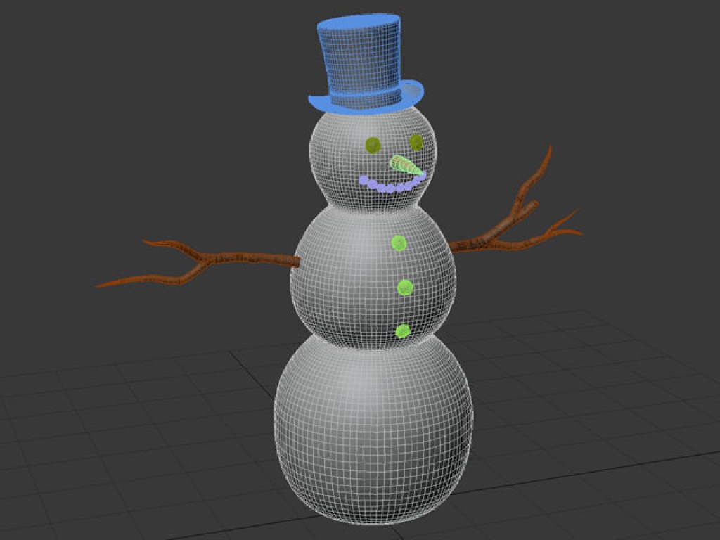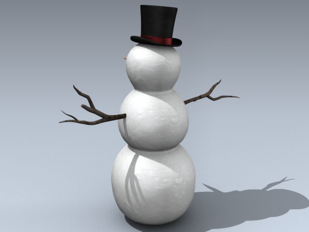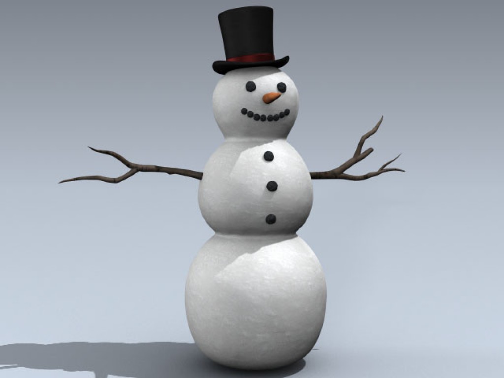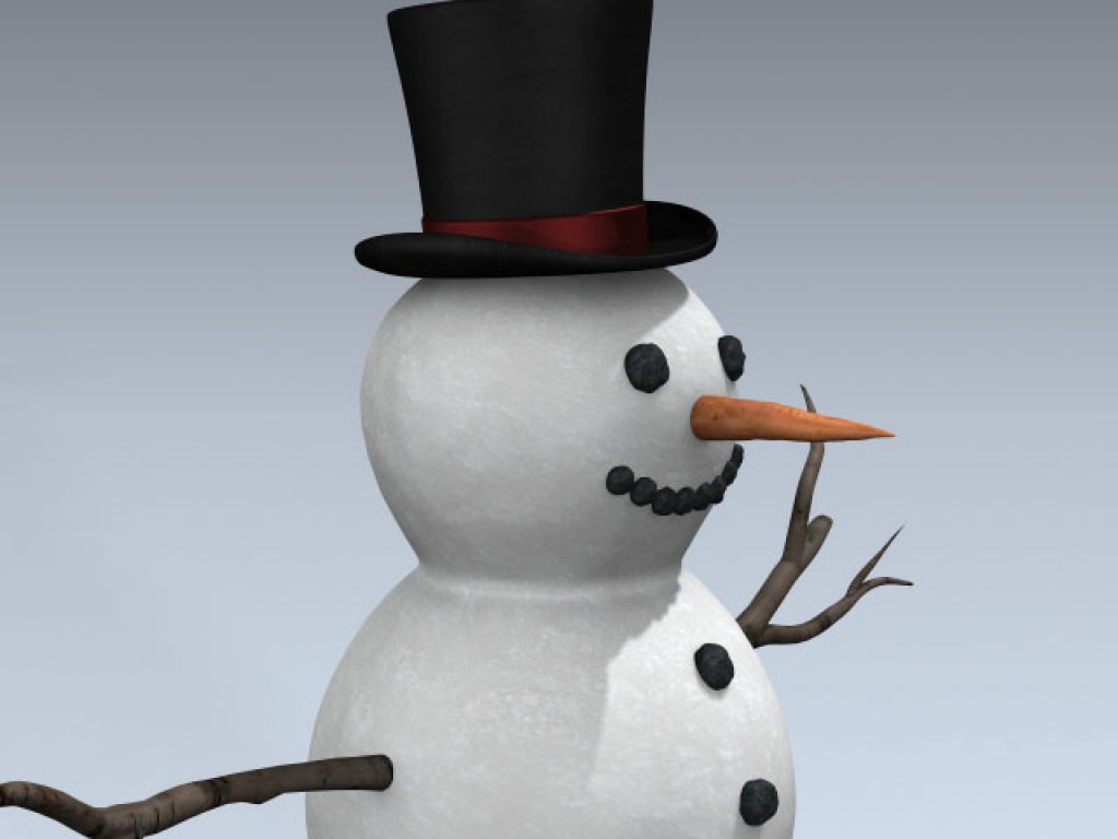 Very detailed winter snowman with separate coal eyes and mounth, sticks as arms, and a carrot nose. Includes a detailed top hat as well. All of the details are separate objects for animating.