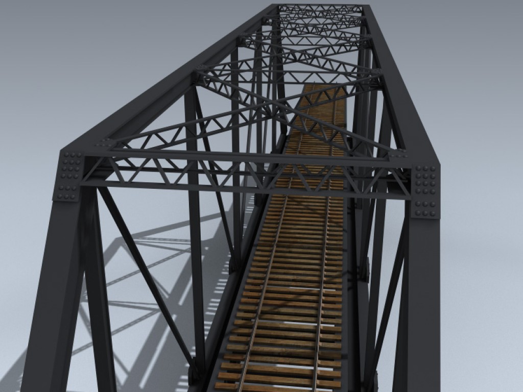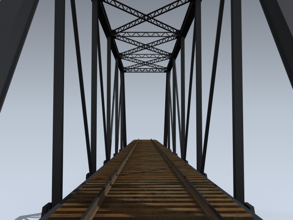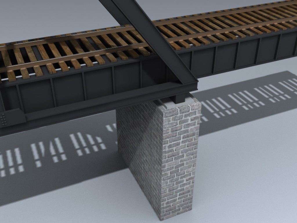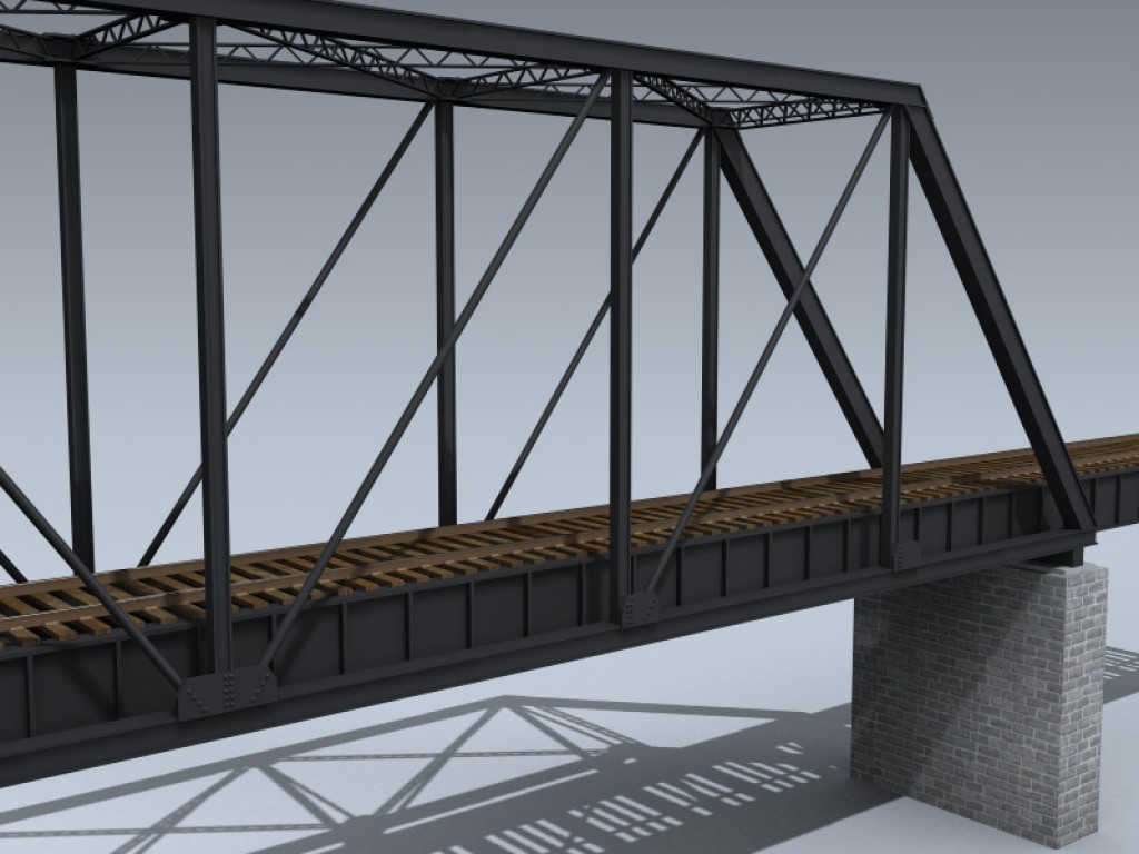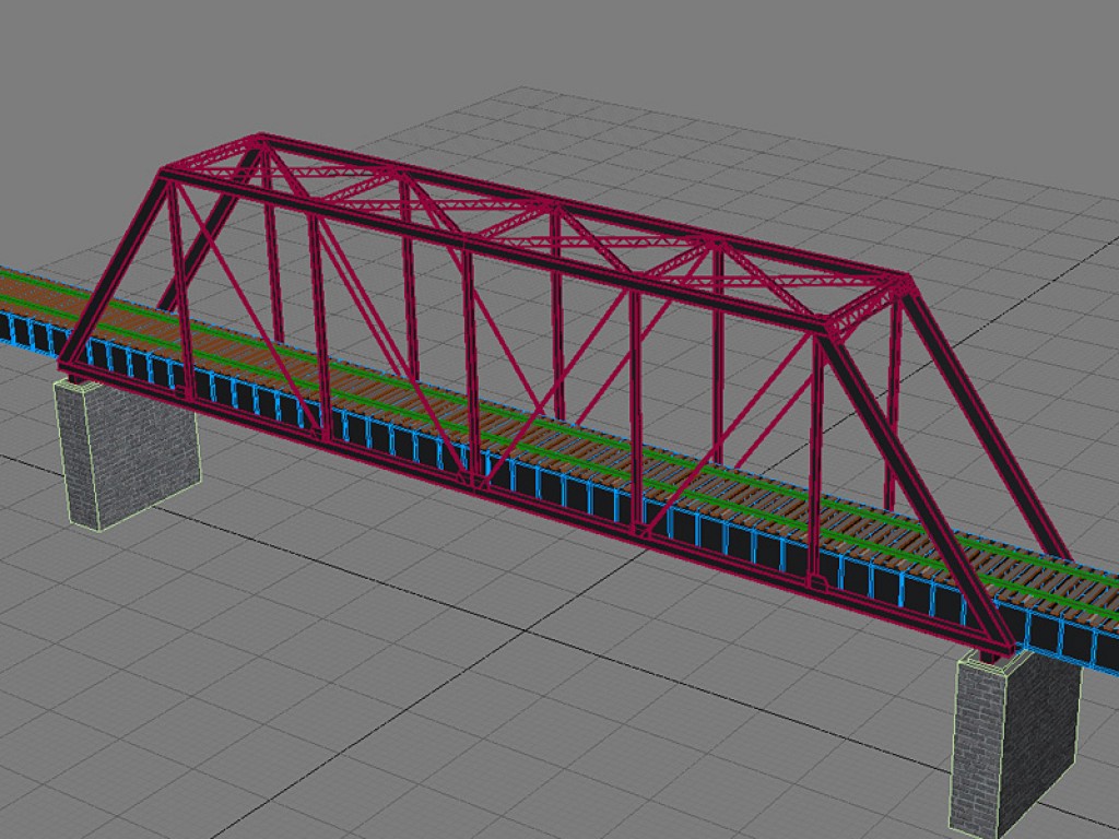 Detailed trestle-style train bridge with train track. Bridge structure and footers can be cloned and moved to easily create longer spans.