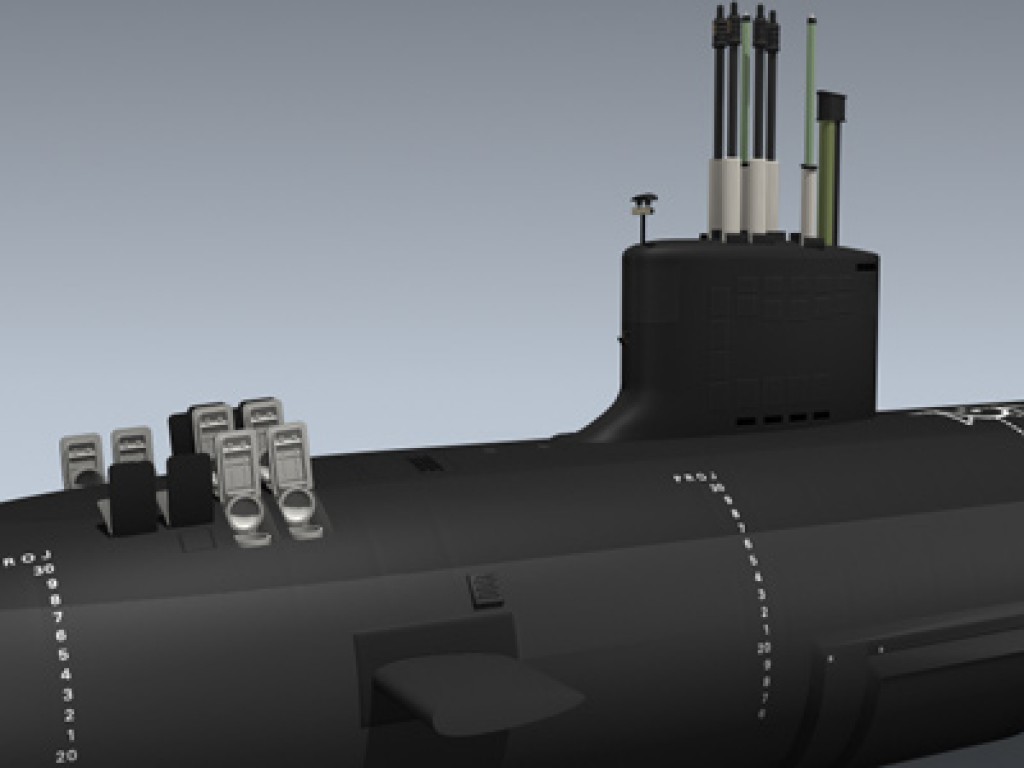 Model depicts the first of the Virginia class submarines in its initial Block 1 configuration. Features very detailed exterior, twelve top-firing missile tubes, and the full array of sail-mounted photonics and sensors.